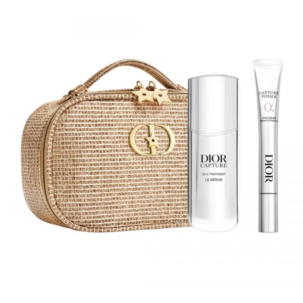 El Estuche DIOR Capture Treatment Ritual es un set antiedad de lujo que ofrece el tratamiento completo para rostro y contorno de ojos. Incluye el potente Capture Totale Le Sérum firmeza y luminosidad y la Crema Contorno de Ojos antifatiga, presentados en una elegante cosmetiquera dorada.