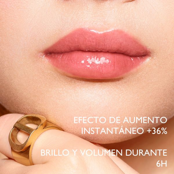 El estuche de este gloss con ácido hialurónico repulpante se adorna con las letras DIOR en relieve plateado, entrelazadas en una tipografía logomanía para una firma estilo joya.