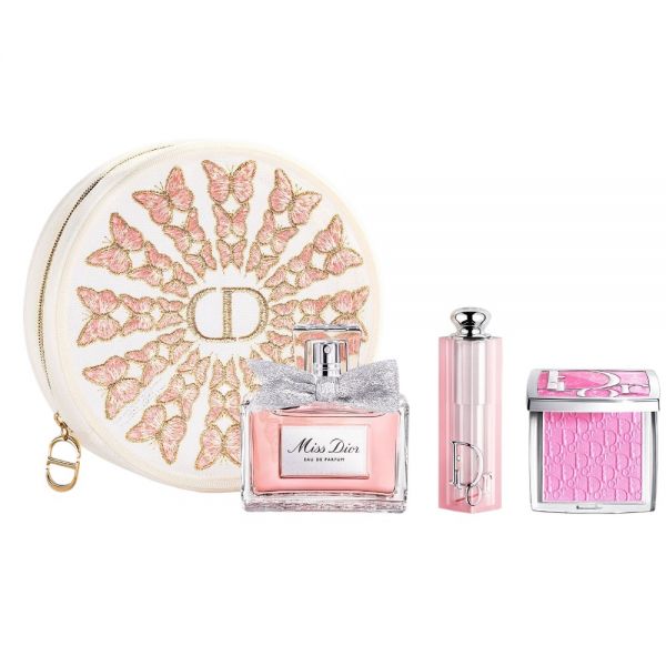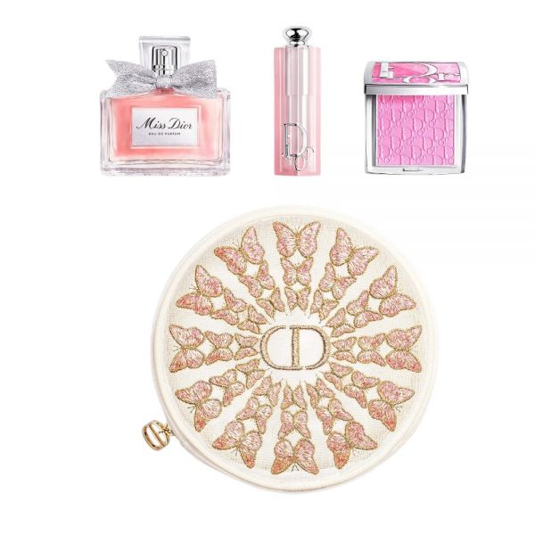 Dior se complace en presentar un delicado neceser de belleza de edición limitada, adornado con un llamativo círculo de mariposas en pleno vuelo. Sus delicadas alas revelan un vibrante degradado de tonos rosa, albaricoque y coral acentuado con toques dorados. Incluye una rutina de maquillaje y fragancia compuesta por 3 productos esenciales de Dior: