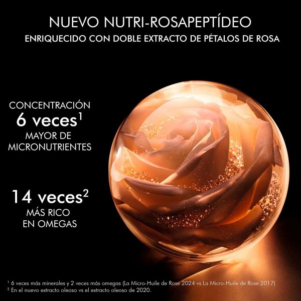 Su fórmula enriquecida con Nutri-Rosa peptide ayuda a que las pieles cansadas con falta de elasticidad y luminosidad se recuperen más rápido. Presenta una concentración 6 veces superior en 22 micronutrientes de Rosa de Granville, contiene un extracto oleoso 14 veces más rico en omegas reparadores e incluye ácido hialurónico repulpante. Esenciales para favorecer los mecanismos de recuperación en el origen de una piel joven y flexible, los omegas se protegen cuidadosamente en el interior de las 10 000 microperlas.