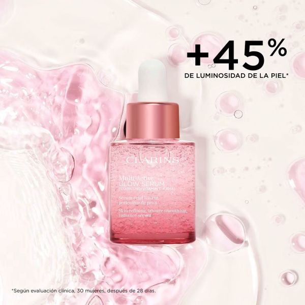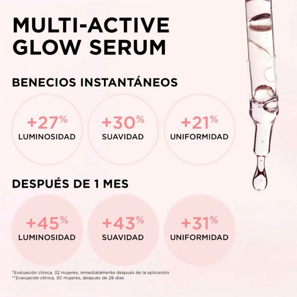 Gracias a su suave acción exfoliante y a su poder unificador Multi-Active Glow Serum mejora la luminosidad, alisa, reduce las irregularidades de la tez y afina la textura de la piel.